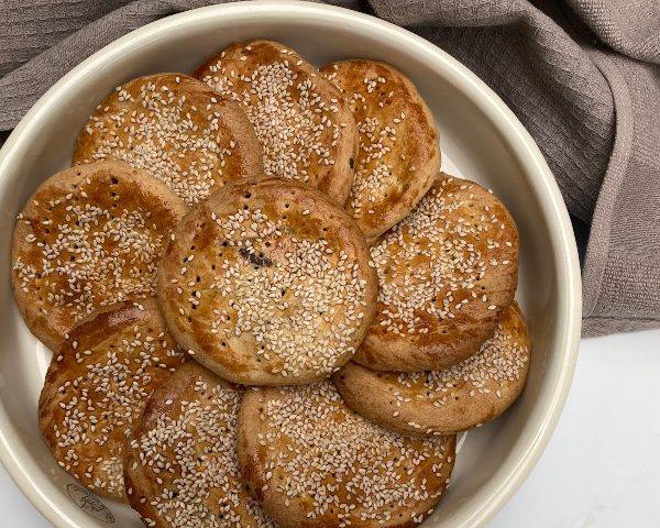 מכסים את כל הכדורים המוכנים. לוקחים כדור אחד מועכים מעט עם היד ומרדדים עם מערוך לצורה עגולה שטוחה (קוטר 9 ס"מ), מחוררים עם מזלג, מברישים בביצה טרופה ומפזרים שומשום.