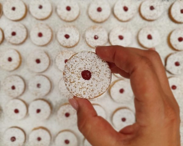 אופים ב180 מעלות עד להזהבה. מקררים, מזלפים ריבה על העוגייה ללא החור באמצע, סוגרים עם עוגייה נוספת עם חור כך שהריבה תבצבץ.