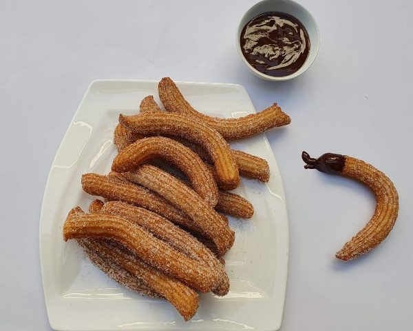 ניתן לטבול את הצ'ורוס בסוכר וקינמון או לטבול בקרם שוקולד.