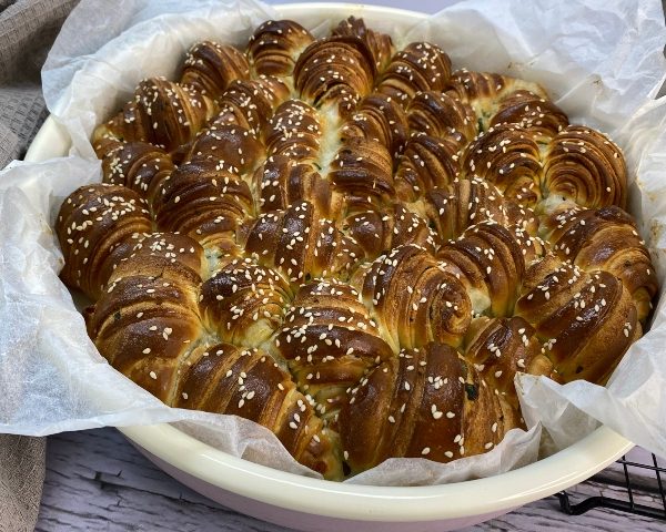 מעבירים את כל הרוגעלך לתבנית עם נייר אפייה, מתפיחים כחצי שעה, מורחים ביצה מדוללת במעט מים